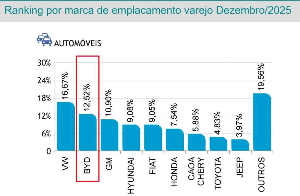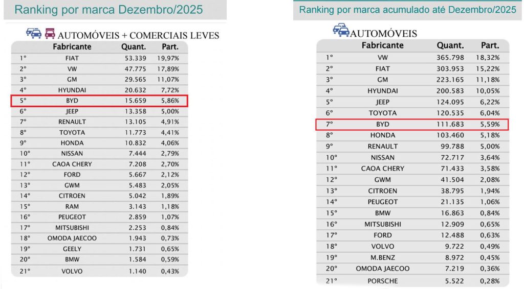 O fechamento do ano de 2025 consagrou a BYD em sétimo lugar entre as marcas de carros que mais emplacaram veículos leves (não comerciais) no Brasil, com 111.683 unidades registradas, o que garante também a participação de mercado com uma fatia de 5,59% de toda a indústria de automóveis. Considerando a soma com comerciais leves no acumulado de 2026, a greentech fica em oitavo lugar, ainda no Top 10, uma participação de 4,43% do mercado.