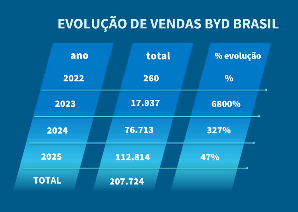 A trajetória da BYD no Brasil é notável: ao chegar ao país em 2022, a montadora vendeu apenas 260 veículos. No ano seguinte, em 2023, registrou um salto expressivo de 6.800%, com cerca de 17 mil carros emplacados. Já em 2024, a empresa consolidou seu crescimento no mercado brasileiro ao superar 76 mil veículos eletrificados vendidos, um recorde histórico. Em 2025, a BYD manteve sua curva ascendente e alcançou a marca de mais de 112 mil carros eletrificados vendidos em um único ano, reforçando sua posição como uma das marcas que mais crescem no setor automotivo no Brasil.