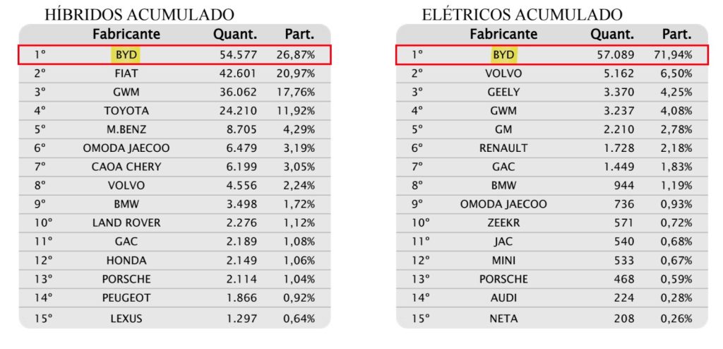 Em 2025, ainda segundo dados da Fenabrave, a BYD segue na liderança absoluta em veículos eletrificados. No segmento de elétricos (BEV) a marca garante 72% de market share com, 57.089 unidades emplacadas, o que significa precisamente 2,62 vezes a soma de todos os outros fabricantes da lista combinados.