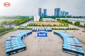 Os ônibus de 12 metros totalmente elétricos foram entregues numa cerimônia na fábrica de Qingdao, na China. Um